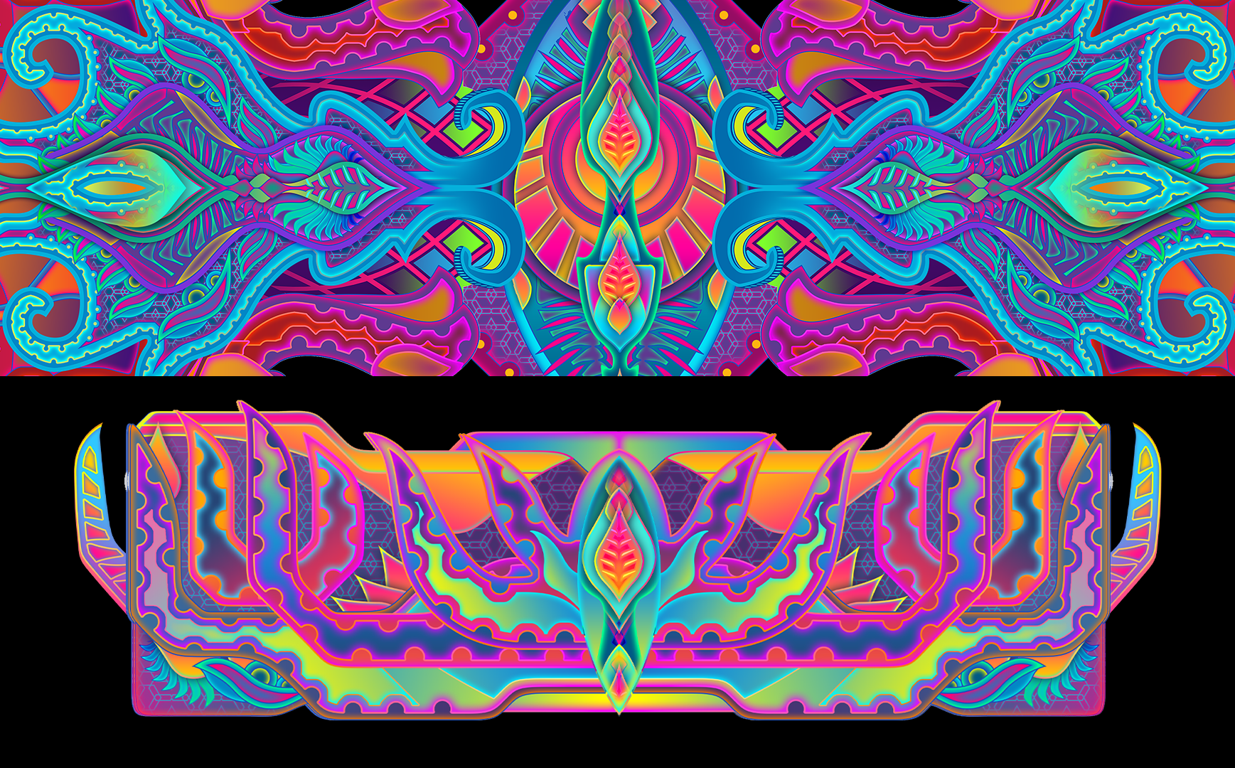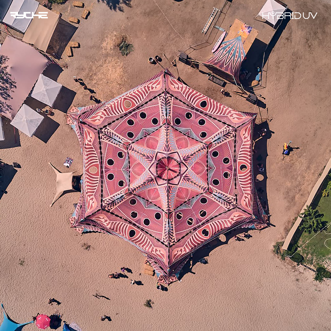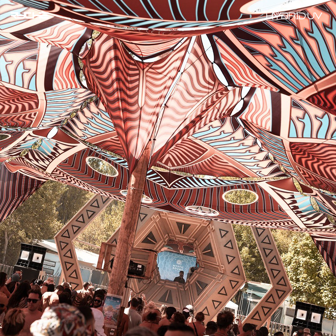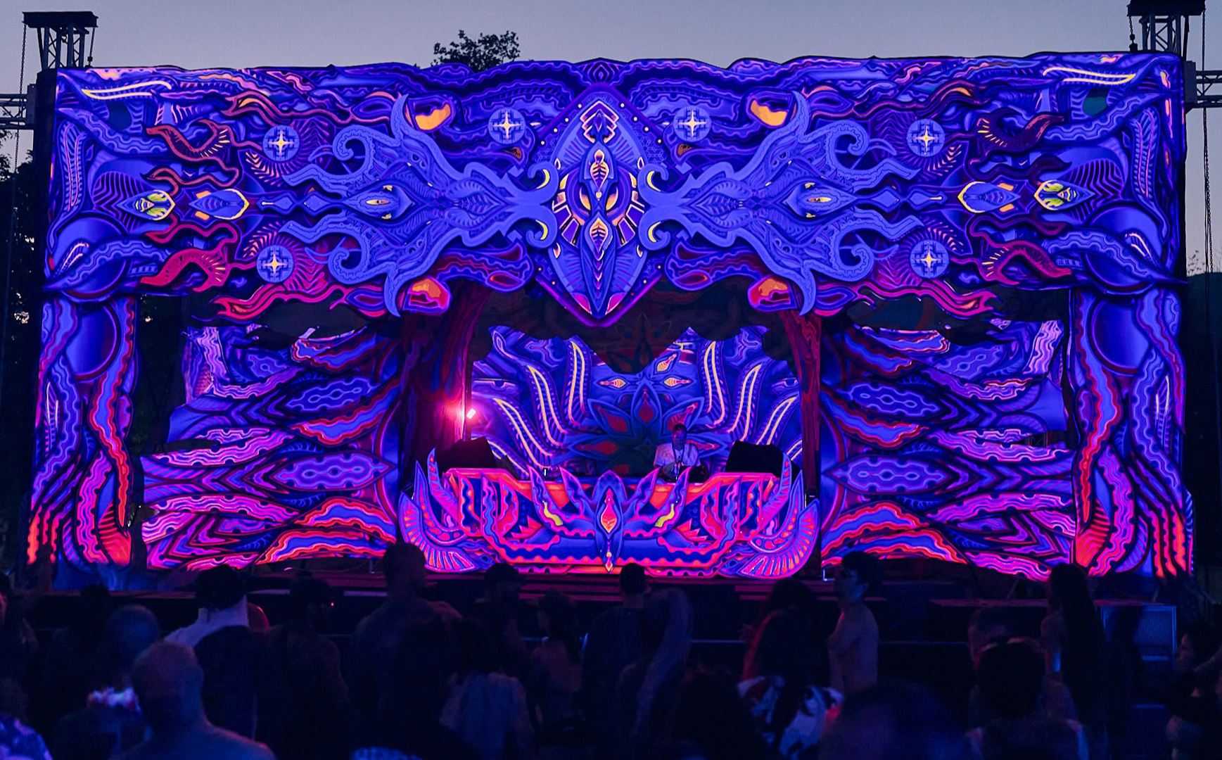 Besides the two canopies, the Enlightenment stage featured a multi panel stage fascia with detailed artwork on all the 50+ individual pieces that came together to form the structure